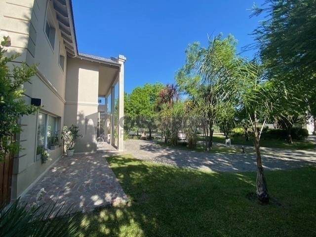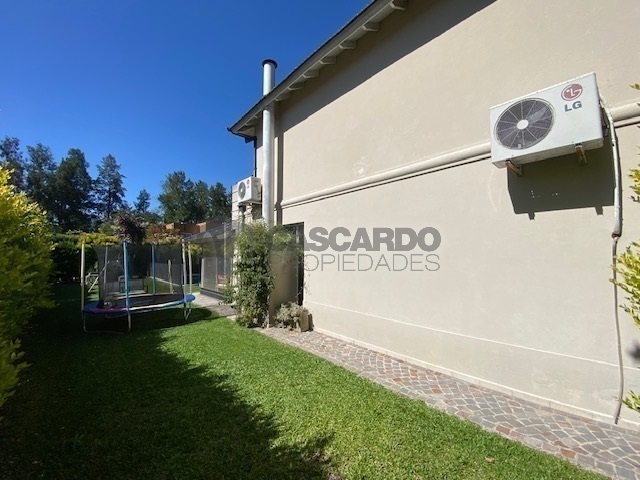 Chalet de 6 ambientes con detalles de categoría sobre lote interno de 814 m2 totales de los cuales 400 m2 son cubiertos (Ancho 21.50 x 35 de largo). En planta baja gran hall recibidor en doble altura con frentes vidriado y puerta principal de doble hoja. Living comedor diario con pisos en madera, hogar a leños de la marca Lepen, amplia luminaria, pantalla automática para proyectar. Toilette de recepción. Baulera en bajo escalera con estantes. Escritorio y/o suite con placar embutido con interiores y baño completo. Amplio play room de 40 m2 aprox con pisos en porcelanato y ventanal al frente. Cocina comedor amplia con muebles bajo mesada y alacenas, más isla que se usa de mesa para 5 comensales, instalación para lavavajillas, espacio despensa y sector heladeras, artefacto de cocina industrial marca Ariston de 5 hornallas a gas más horno eléctrico, spar con luces led. lavadero separado con muebles bajo y alto mesada. Sistema de piso radiante que abarca un 85% de la propiedad, mediante caldera independiente. Termotante de 160 lts marca Rheem. Galería con cerramiento en toldos traslucidos más 1 toilette de parque. Baulera guarda herramientas con estantes. Parrilla con cerramientos, guarda carbón, leña, madera, etc. Pergola en caño galvanizado con lona militar instalada. Parque amplio totalmente cercado de alambre y cerco vivo. La piscina se encuentra actualmente cercada con caño y media sombra "pero se quita fácilmente" con una medida de 10 x 5.50 (50 m2 aprox.) la misma revestida en cerámicos imitación venecita, luces led con control remoto. Sector motor de piscina, filtro, bomba sumergible y el sistema de riego por aspersión todo funcionando correctamente. Luces en todo el perímetro dividido con fotocelula ó manual. En planta alta, amplio hall distribuidor. Baño completo con doble bacha y ante baño con bañera y sanitarios completos. 2 dormitorios con techos altos en madera con opción a entrepiso, ambos con sus respectivos placares embutidos. 2 máster suites con techos altos, ambas con vestidor, balcón al contra frente, baños completos e hidromasaje. La casa esta equipada con 5 equipos de aire acondicionados. Losa radiante. Generador a gas marca Generac de 8 kva. Techos de madera con tejas francesas. Sistema de 5 cámaras de seguridad. Entrada para varios autos descubierta.